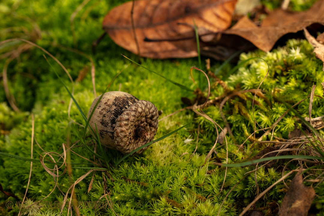 Macro photograph of an Acorn on Moss taken at the Busiek Forest in Missouri