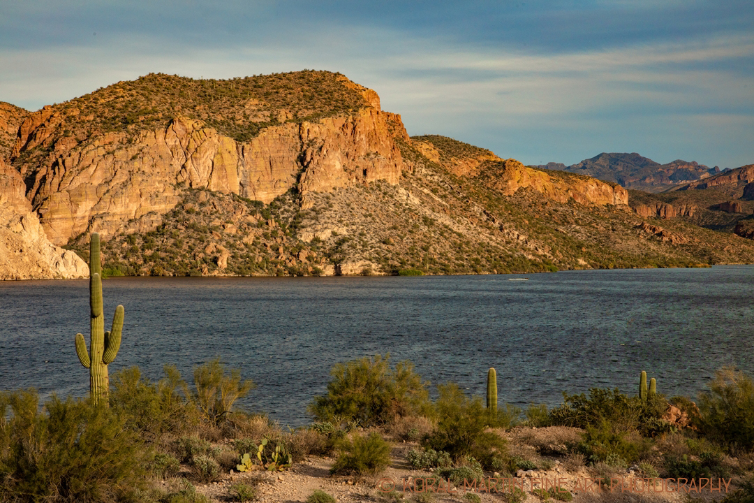 The Apache Trail is one of the most scenic drives near the Phoenix area. This well-traveled road affords visitors an incredible view of canyons, geologic formations, desert plants and trees, desert and lake views, and wildflowers in season. Canyon Lake is about 15 miles from where Arizona 88, the Apache Trail, begins. The lake is beautiful with the saguaros an other cactus along the edges and the nice rock formations.