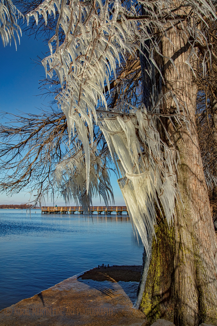 Reelfoot Lake is a shallow natural lake located in the northwest portion of Tennessee. It was formed during the New Madrid Earthquakes of 1811 and 1812. The lake is a shallow lake and there are Cypress trees lining the lake and even out in the lake. In the winter it is not uncommon to find ice formations on the cypress trees.