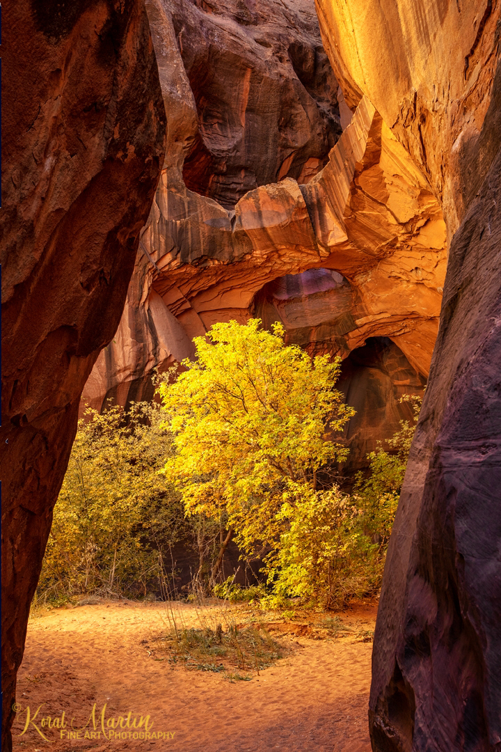 Golden Cathedral is located in Neon Canyon in Escalante Utah. It was an extreme hike in and out with about a total of 1900ft change in elevation with the first mile and last mile being the steepest. It was worth the hike to the fascinating canyon formation and it was nice to catch some fall color