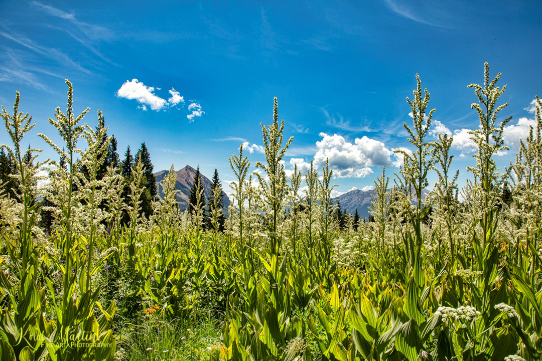 This year was a bumper year for wildflowers in Colorado due to the amount of snow that was received over the winter.  The False Hellebore were thick in the upper regions of the Snodgrass Trail and were even towering over us as we hike. This trail is located off of Gothic Road north of Crested Butte near the Kebler Pass.