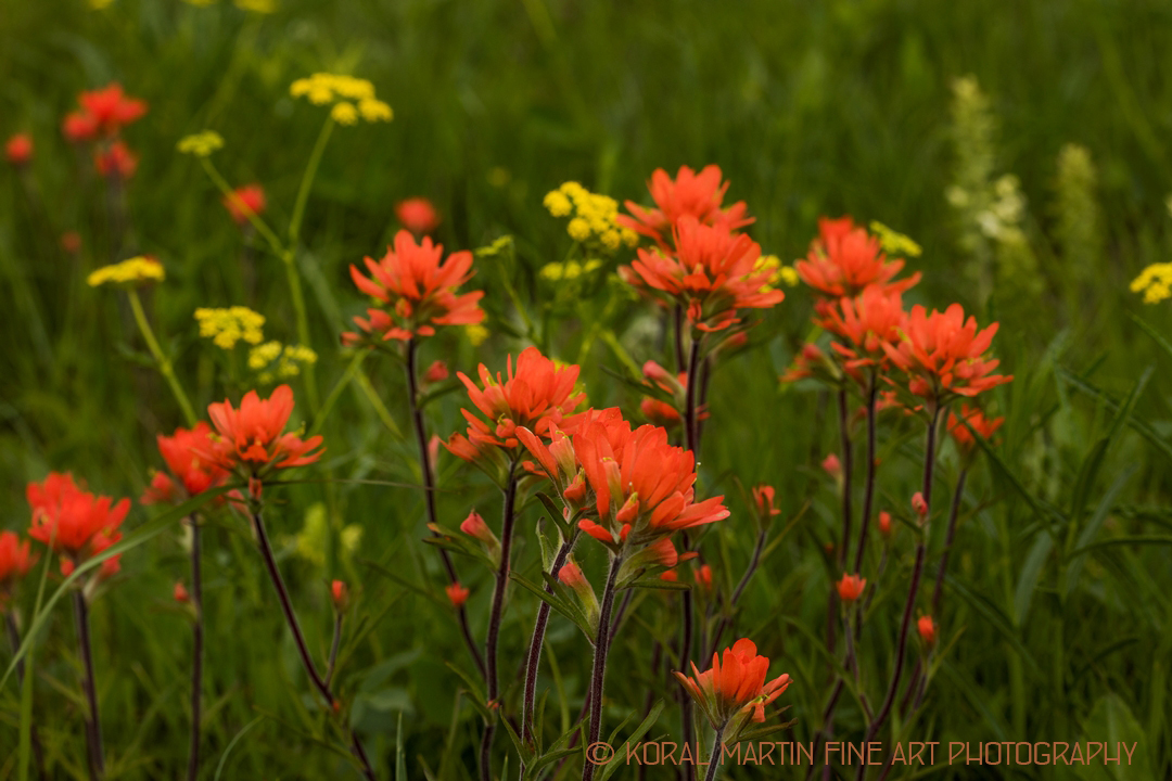 Indian Paintbrush and yellow wildflowers taken at Woods Prairie. Love the colors of the prairie in the summer time.