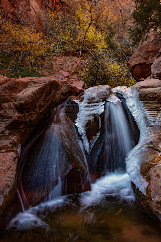 This is a middle waterfall at Kanarraville Slot Canyon. It is a fascinating slot canyon with Kanarra Creek running thru it and multiple waterfalls. Its not often you get to traverse a slot canyon thru water and see such beautiful falls. Was a wonderful destination. It was cold weather when I went so there was even some ice.