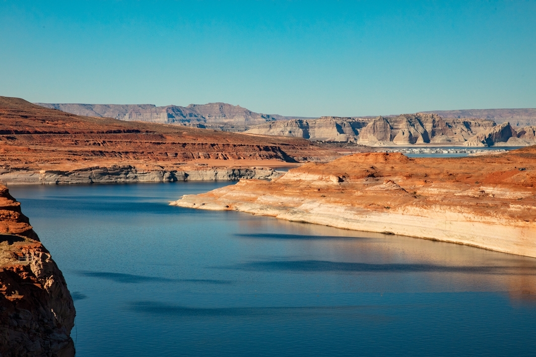 Lake Powell is located on the edge of Page Arizona. The lake is a vibrant view which is enhance by the white rock formations along it.