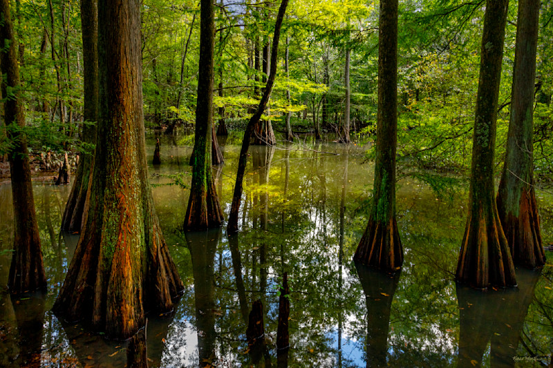 The cypress trees along and in Reelfoot Lake in Tennessee are fascinating. This day I was visiting Grassy Island and was walking along the road enjoying the swampy area along it with the cypress trees. I found this area that had really nice light coming in that highlighted the detail of the texture and color on the tree in the foreground with nice light in the back too with wonderful reflections. The colors and details were amazing. Loved being able to capture this!