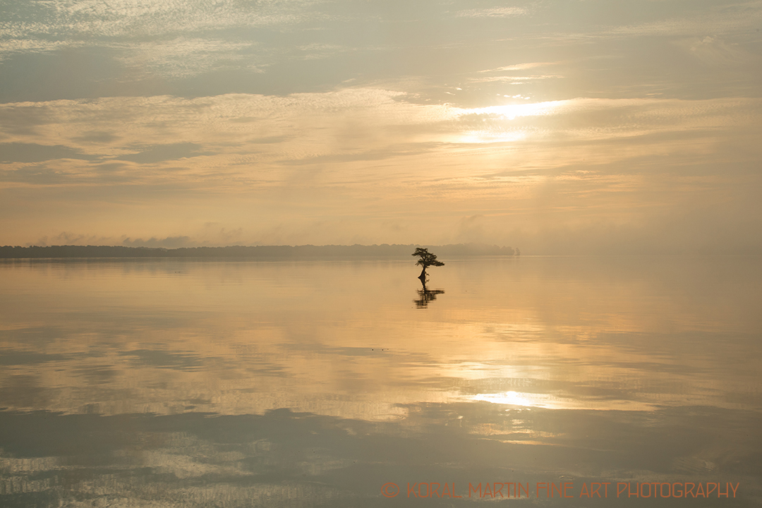 Sunrise at Reelfoot Lake on a hazy morn. There was a lone cypress tree out in the water.