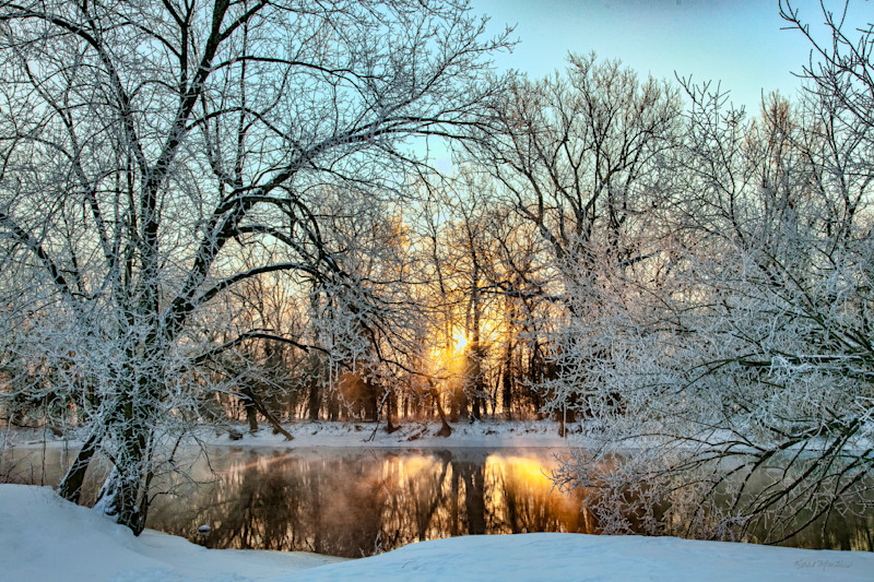 We have had quite the winter all in the last 2 weeks here in Missouri.  We have had ice, snow, freezing fog, and well below minus temps. This is at the tail-end of all of this and the night before we had freezing fog  which made for great ice on the trees and the river was really steaming in the glow of the sunrise.