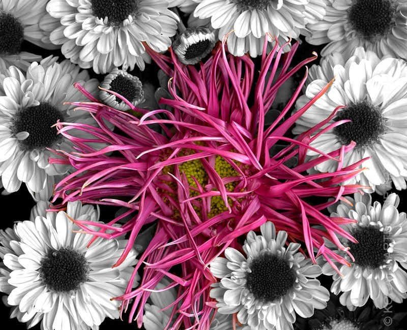 Macro Studio Capture of Spider Mum – Wild Thing. Color on black and white.