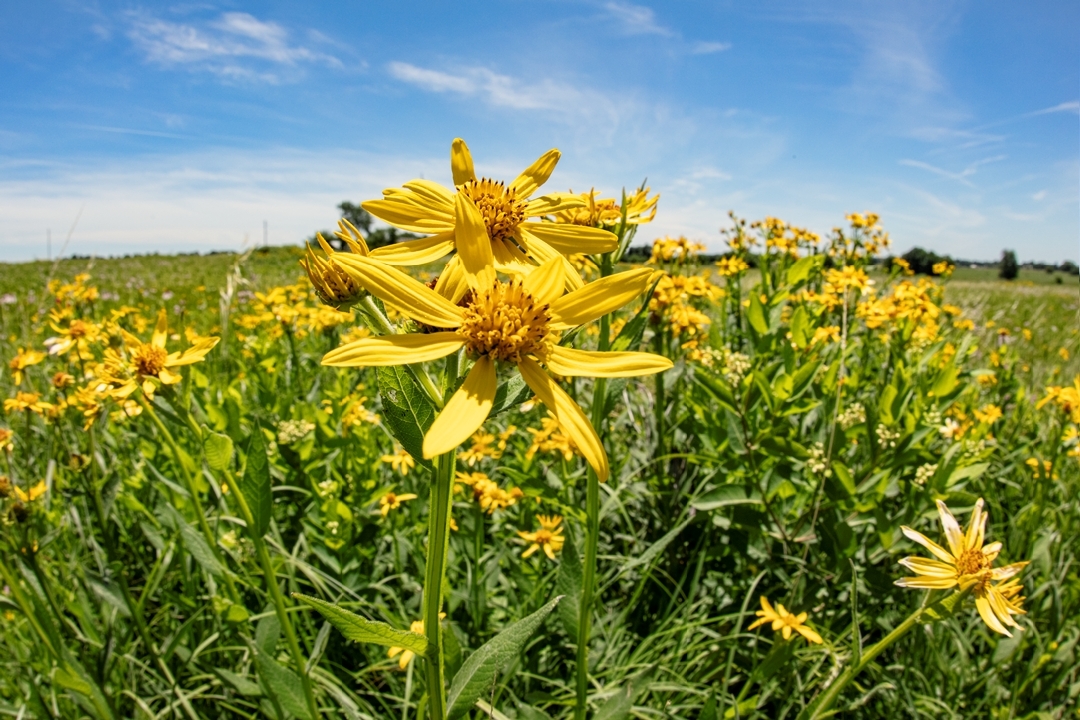 Wildflowers are beautiful but its always interesting to see their environment along with their specific beauty. This photo of the Yellow Crownbeard was taken with a special wide angle lens that lets you see the flowers around and the beautiful blue sky. Makes you feel like you are right out in the prairie with the flowers. This was taken at Mount Vernon Prairie in Missouri.