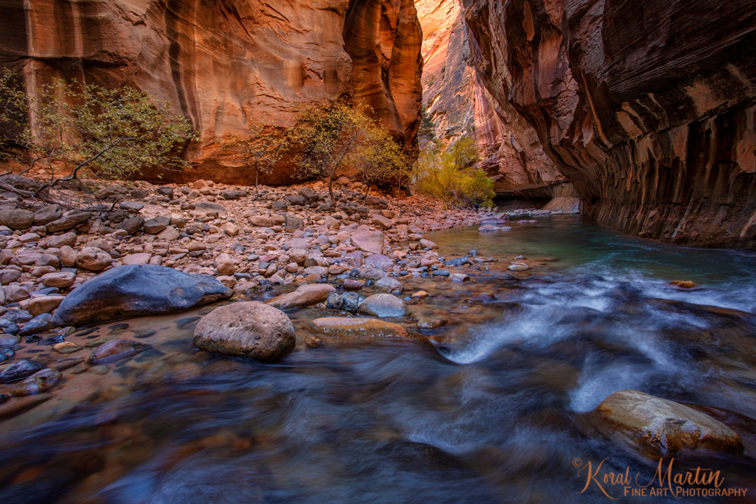 The Zion Narrows is a hike through the canyon while walking in and out of the Virgin River which flowed over wonderfully colored round boulders. Beautiful rock formations make up the canyon walls with different colors, shapes, lines and textures. Occassionally on this hike I was able to even catch some nice fall color.