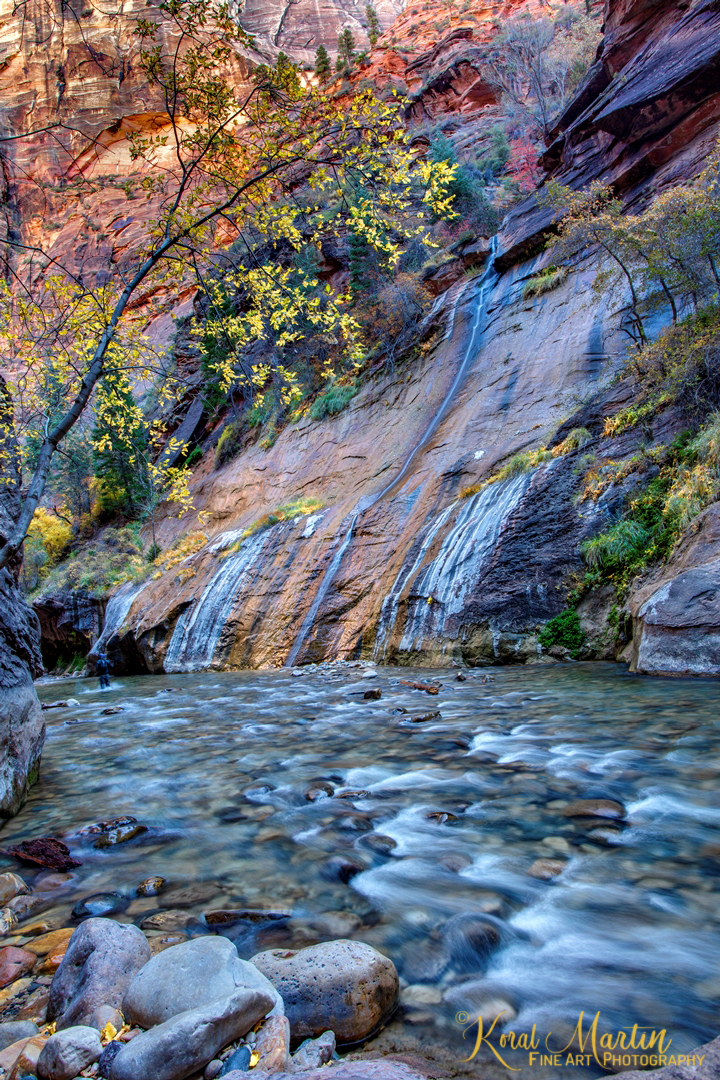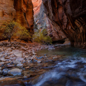 The Zion Narrows is a hike through the canyon while walking in and out of the Virgin River which flowed over wonderfully colored round boulders. Beautiful rock formations make up the canyon walls with different colors, shapes, lines and textures. Occassionally on this hike I was able to even catch some nice fall color.