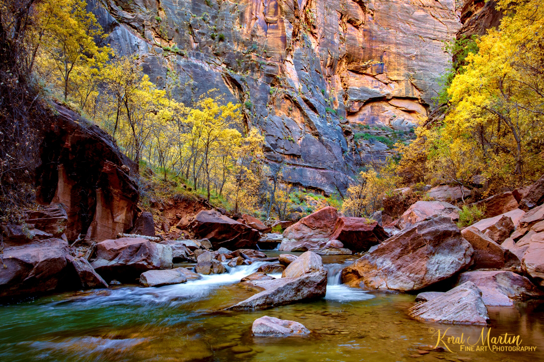 The Zion Narrows is a hike through the canyon while walking in and out of the Virgin River which flowed over wonderfully colored round boulders. Beautiful rock formations make up the canyon walls with different colors, shapes, lines and textures. Occasionally on this hike I was able to even catch some nice fall color.